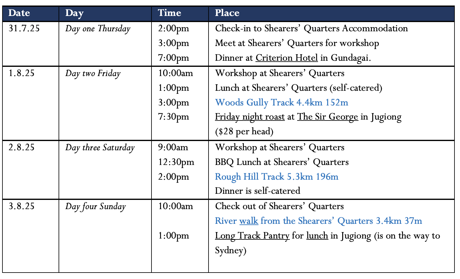 Where and what: There’ll be side trips to the river and to Jugiong, The Sir George, Long Track Pantry, and nearby Gundagai. A walk or two. But mostly conversation and writing guidance and the inspiration of the place.